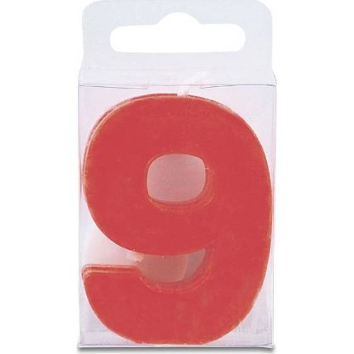 Svíčka ve tvaru číslice 9, výška 4 cm, červená barva. Je vhodná především na narozeninový dort a zdobení podobných moučníků.