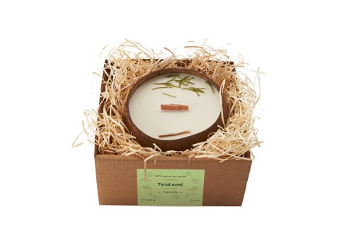 Svíčka z kokosu - Vůně lesa - Sójové svíčky v kokosové skořápce jsou krásnou ozdobou a dekorací. Svíčky neobsahují parafín, který je vedlejším produktem ropného průmyslu. Spalováním parafínu se do vzduchu uvolňují nebezpečné toxiny, které potom vdechujeme. Svíčka obsahuje bavlněný knot, tedy čistě přírodní, bez obsahu boraxu, do kterého se jinak knoty namáčí, aby se uměle docílilo lepšího hoření. Do vosku přidáváme pouze kvalitní esenciální oleje z lokálních zdrojů. Svíčky jsou odlévány a zdobeny ručně. Každá se tedy od sebe trochu liší. Sojový vosk hoří přibližně dvakrát déle, než ten parafínový, u 100 g vosku je to +- 20 hodin.
