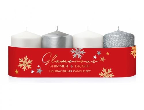 Sada adventních svíček. Mají tvar válce a tvoří kombinaci několika druhů dekorů: matný, metalický, lakovaný a brokátový. Všechny povrchy jsou sladěny do stejné barvy. Adventní věnce s nimi vypadají neobyčejně. Doba hoření: 30 hodin. Rozměry: průměr 5 cm, výška 7 cm. Obsah balení: 4 ks svíček. Barva: stříbrná.