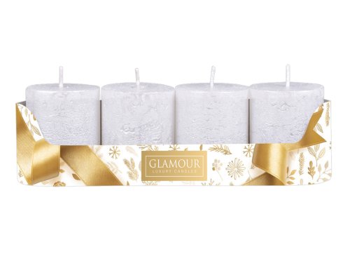 Rustikální adventní svíčky ve tvaru válce. Svíčky mají metalický povrch. Budou se vyjímat v moderním, dobovém i rustikálním interiéru. V balení jsou 4 kusy. Doba hoření: 21 hodin. Velikost svíčky: průměr 5cm, výška 6cm. Barva: bílá.