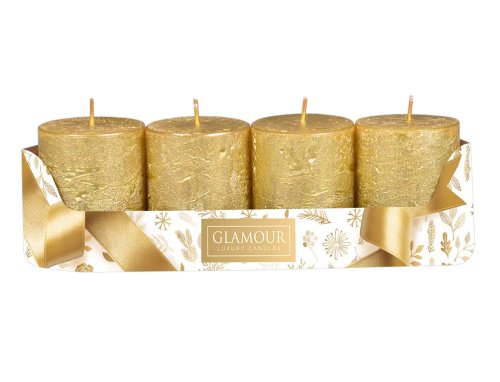 Rustikální adventní svíčky ve tvaru válce. Svíčky mají metalický povrch. Budou se vyjímat v moderním, dobovém i rustikálním interiéru. V balení jsou 4 kusy. Doba hoření: 21 hodin. Velikost svíčky: průměr 5cm, výška 6cm. Barva: zlatá.