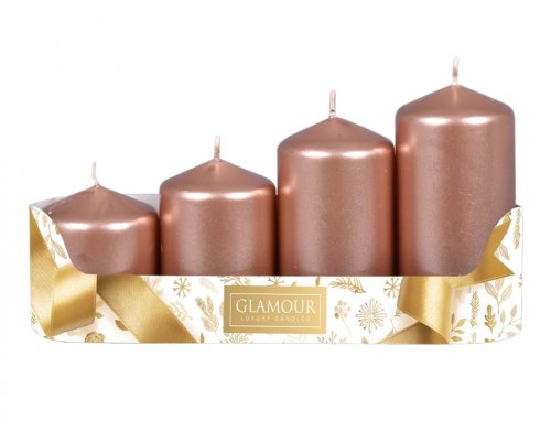 Sada adventních svíček stupňovitých. Mají tvar válce a plochou hlavu. Povrch svíčky je metalicky lesklý. Adventní věnec rozzáří. Doba hoření: 8-20 hodin. Rozměry: průměr 5 cm, výška 6/ 7,5/ 9/ 10,5 cm. V balení jsou 4 ks svíček. Barva: měděná.