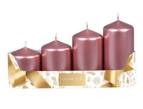 Sada adventních svíček stupňovitých. Mají tvar válce a plochou hlavu. Povrch svíčky je metalicky lesklý. Adventní věnec rozzáří. Doba hoření: 8-20 hodin. Rozměry: průměr 5 cm, výška 6/ 7,5/ 9/ 10,5 cm. V balení jsou 4 ks svíček. Barva: růžovo-zlatá.