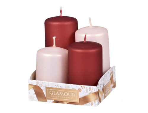 Adventní stupňovité svíčky, matně metalické, s plochou hlavou. V tradičních barvách Vánoc. Rozměry: průměr 4 cm, výška: 6/7/8/9 cm. Doba hoření: 11/12,5/14,5/16,5 h. Materiál: parafín. Balení obsahuje 4 ks svíček. Barva: červená, zlatá.