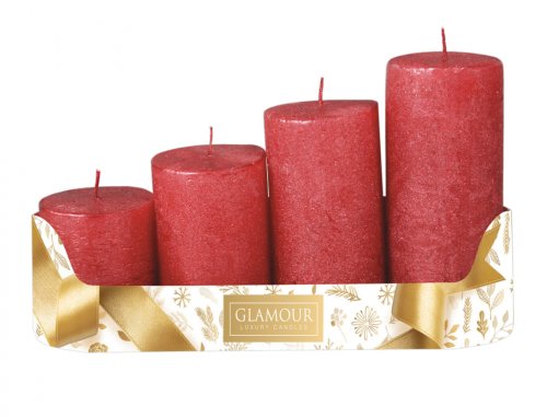 Adventní svíčky s rustikálním matným povrchem. Svíčky jsou stupňovité: průměr: 5 cm, výšky: 6 cm, 8 cm, 10 cm, 12 cm. Barva: červená.
