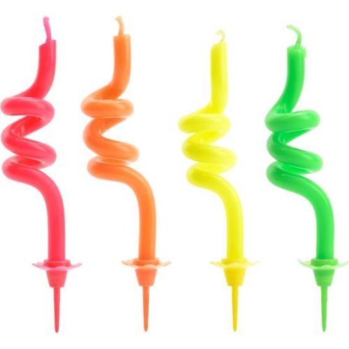 Svíčky na dort ve veselých barvách mají zajímavý zakroucený tvar. Výška 8 cm, v balení 4 ks svíček.