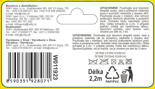 Seznam varování týkajících se bezpečnosti skákaček vychází z požadavků nařízení (EU) 2023/988 o obecné bezpečnosti výrobků (GPSR). 1. Ujistěte se, že máte dostatek místa: Než začnete skákat, zkontrolujte, zda kolem vás nejsou žádné překážky, jako je nábytek, lidé nebo zvířata. Náraz o něco během skákání může způsobit zranění. 2. Zkontrolujte stav švihadla: Než začnete cvičit, ujistěte se, že švihadlo není poškozeno. Rozbité lanko nebo poškozené úchytky mohou být nebezpečné. 3. Přizpůsobte délku švihadla: Ujistěte se, že švihadlo má správnou délku. Příliš dlouhé nebo příliš krátké švihadlo může ztěžovat cvičení a zvýšit riziko zakopnutí. 4. Skákejte na vhodném povrchu: Vyhněte se skákání na tvrdých, nerovných nebo kluzkých površích. Nejlepší jsou tlumící povrchy, jako je dřevo, guma nebo podložka na cvičení. 5. Začněte pomalu: Pokud s švihadlem teprve začínáte, začněte s pomalejšími otáčkami a postupně zvyšujte tempo. Vyhnete se tak přetížení svalů a kloubů. 6. Používejte vhodnou obuv: Skákejte v sportovních botách, které zajišťují správné tlumení nárazů a podporu pro nohy. Skákání naboso nebo v nevhodné obuvi může vést k zraněním. 7. Dbejte o správnou techniku: Zaměřte se na udržování správného držení těla a techniku skákání. Vyhněte se skákání příliš vysoko nebo široce, abyste nepřetěžovali klouby. 8. Dávejte pozor na děti a zvířata: Pokud cvičíte v přítomnosti dětí nebo zvířat, ujistěte se, že jsou bezpečné a nepřekáží při cvičení. 9. Uchovávejte švihadlo na bezpečném místě: Po ukončení cvičení uchovávejte švihadlo mimo dosah dětí a zvířat, aby nedošlo k náhodnému zamotání nebo spolknutí. 10. Udržujte švihadlo v čistotě: Pravidelně čistěte švihadlo, abyste odstranili nečistoty a pot. 11. Ukončete trénink, pokud pocítíte bolest: Pokud během skákání pocítíte bolest, okamžitě přerušte cvičení a odpočiňte si. Neignorujte bolest, protože to může vést k vážnějším zraněním. 12. Poraďte se s lékařem: Pokud máte nějaké zdravotní problémy, jako jsou problémy s klouby, srdcem nebo krevním oběhem, poraďte se před zahájením cvičení s švihadlem s lékařem.