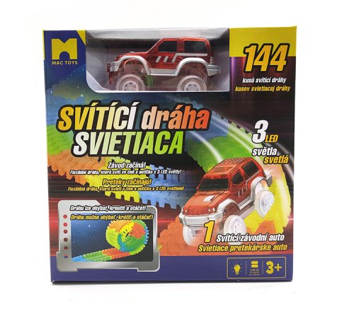 Svítící dráha s 144 díly a autíčkem, které svítí. Dráha je flexibilní a dá se z ní postavit jakýkoliv tvar. Buď kreativní a postav si dráhu podle sebe. Dráha ve tmě fosforeskuje.