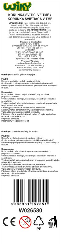 Kreativní sada Svítící korunka je párty doplněk určený především pro děti, který umožňuje sestavení svítící korunky s chemiluminiscenčním efektem pro dětské oslavy, karnevaly a večerní hry.