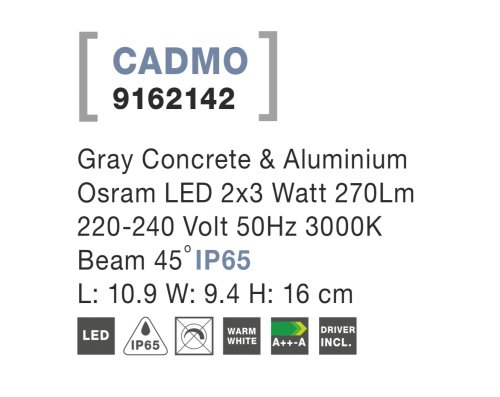 Svítidlo je vyrobeno z vysoce kvalitního hliníku a šedého betonu a je odolné proti tryskající vodě a prachu dle standardu IP65. Díky tomu je jeho životnost velmi dlouhá. Energeticky úsporná LED technologie navíc ušetří vaši peněženku.
