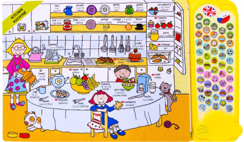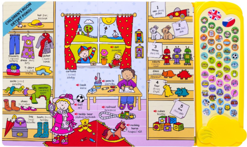 Výuková knížka se zvuky pro nejmenší, určená k osvojení základních slovíček ve dvou jazycích – češtině a angličtině.