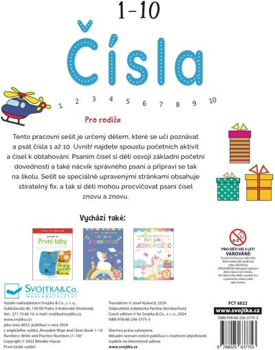 Tento pracovní sešit je určený dětem, které se učí poznávat a psát čísla 1 až 10. Uvnitř najdete spoustu početních aktivit a čísel k obtahování. Psaním čísel si děti osvojí základní početní dovednosti a také nácvik správného psaní a připraví se tak na školu. Sešit se speciálně upravenými stránkami obsahuje stíratelný fix, a tak si děti mohou procvičovat psaní čísel znovu a znovu.