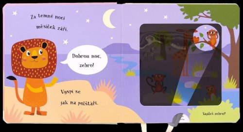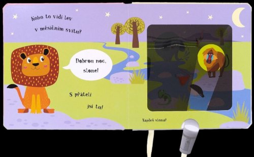 Kouzelné čtení na dobrou noc pro děti. Malý lev už se chystá spát, ale nejprve musí dát dobrou noc všem svým zvířecím kamarádům. Pomůžeš mu je najít? Vsuň kouzelnou baterku mezi stránky a zjisti, kdo se ukrývá v každé ilustraci, zobrazující noc. Text ve verších učí děti vnímat přirozený rytmus řeči. Chytře vyrobená okénka umožňují dětem hledat schovaná zvířátka pomocí přiložené kartonové pomůcky ve tvaru svítilny. Nabídněte svému dítěti před spaním nějakou zklidňující aktivitu. Tato knížka je pro to přímo stvořená.