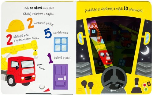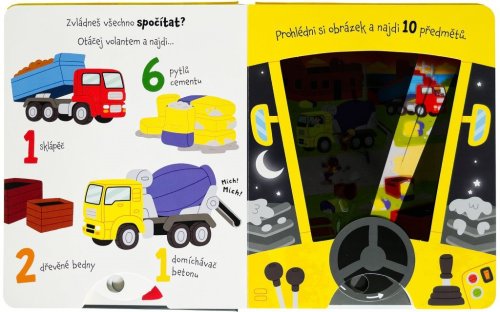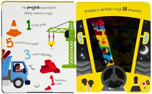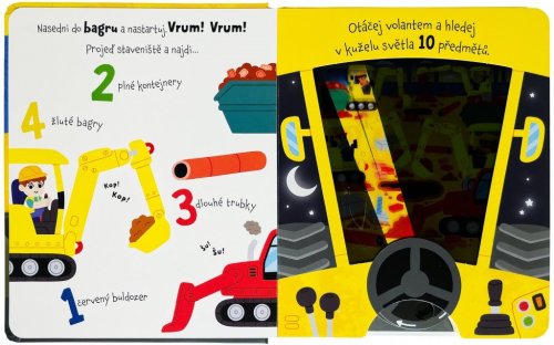 Posaď se za volant a projeď se s bagrem po staveništi. Otáčej volantem na každé stránce, posviť si na cestu, hledej a počítej předměty, které v kuželu světla objevíš. Zvládneš je ve tmě všechny najít? Hrajte si, na každé dvojstraně je nová aktivita!