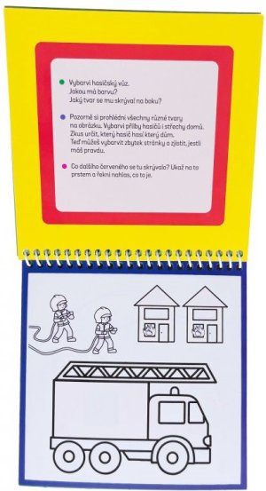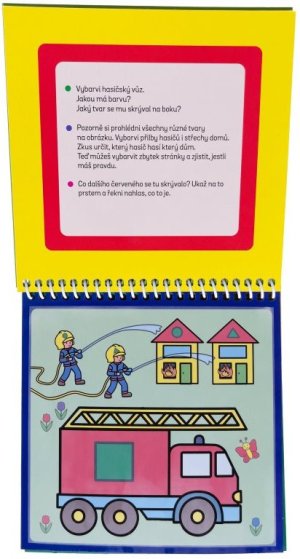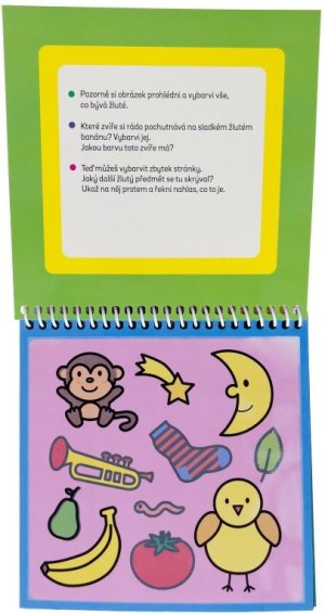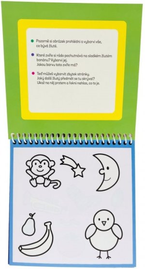 Na stránkách tě čekají úkoly na procvičování tvarů a barev. Dokážeš vybarvit jednotlivé tvary na stránce? Dokážeš pojmenovat všechny barvy a poznáš, co se skrývá v obrázku plném tvarů? Jakmile voda uschne, barvy zmizí a ty můžeš vybarvovat a řešit úkoly pořád dokola.