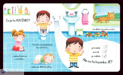 Hovínko se dělá do plíny, splachuje se do záchoda, zvířátka dělají svá hovínka venku... Ale co to vlastně hovínko je? Víš, že jsou brouci, kteří si dělají z hovínek kuličky, a že králík svoje bobky dokonce jí? Na všechny všetečné otázky dětí na téma "Co je to hovínko?" najdou bezradní rodiče odpovědi v této úžasné knížce s odklápěcími okénky.