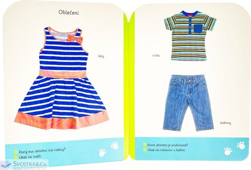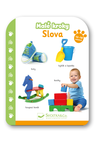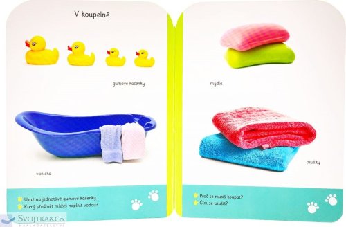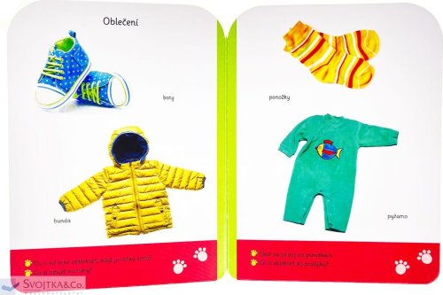 Nechte děti pozorně prohlížet si obrázky. Která hračka má kola? Dokáže váš malý zvědavec ukázat na konkrétní zvíře a ví, jaké oblečení se nosí, když je venku zima? V této knížce z řady Malé kroky se děti interaktivním způsobem zapojí do poznávání a pojmenovávání předmětů z každodenního života, potravin, částí těla či hraček. Rozšiřujte základní slovní zásobu vašeho děťátka na názorných příkladech a otázky a úkoly v dolní části stránky pomohou s hlubším pochopením předmětů a děti si tak více a rychleji osvojí užívání slov a jejich význam. Pevné stránky, výrazné barvy a krátké popisky dětem učení a poznávání světa usnadní a vy si spolu užijete krásné a zábavné chvíle nad touto milou knížkou s množstvím názorných fotografií.
