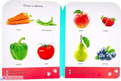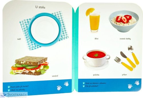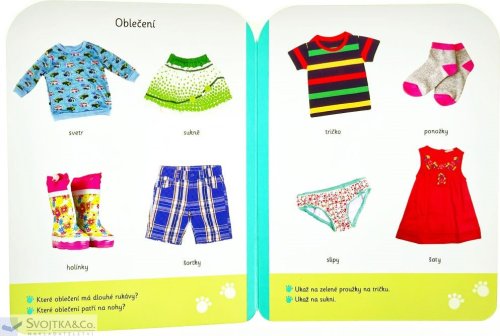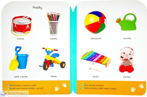 Která hračka vydává zvuky? Které věci si vezmeš na pláž a které jídlo se jí horké? Nechte děti pozorně si prohlížet obrázky a zamyslet se. V této knížce z řady Malé kroky si děti posílí a rozšíří základy slovní zásoby z oblasti předmětů každodenního života, oblečení, potravin či hraček. Rozšiřujte slovní zásobu a rozvíjející se povědomí o světě vašeho děťátka na názorných příkladech. Otázky a úkoly v dolní části stránky pomohou s lepším pochopením a užíváním slov v daném kontextu. Pevné stránky, výrazné barvy a krátké popisky dětem učení a poznávání světa usnadní a vy si spolu užijete krásné a zábavné chvíle nad touto milou knížkou s množstvím názorných fotografií.