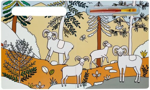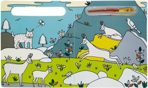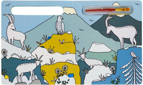 Knížka s pevnými stránkami je plná obrázků zvířat z hor, které jsou částečně barevné.
