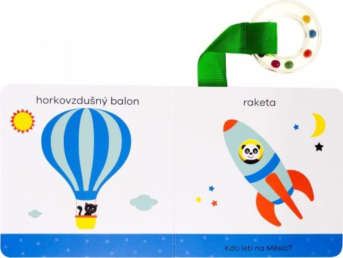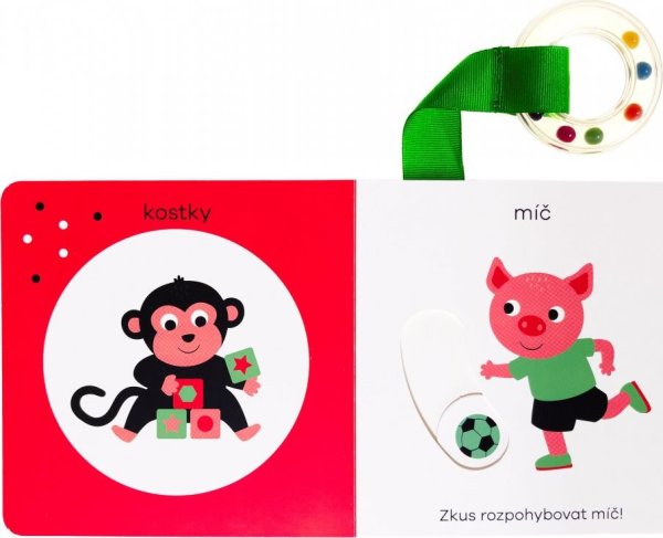 Krásné leporelo pro první objevování světa. Objevuj první slova - toto leporelo, speciálně navržené pro batolata, je plné překvapení. Stačí knížkou lehce zatřást a objeví se plno nečekaných věcí! Tato knížečka pro miminka je přímo určená k tomu, aby s ní dítě třáslo. Slyšíš, jak chrastí? Jakékoli mávání knihou rozhýbe pohyblivé prvky v ilustracích, které díky tomu užijí. Navíc je leporelo vybaveno kulatým chrastítkem na látkovém proužku - ideálním na cumlání a ještě více zábavy a rámusení při třesení knihou.