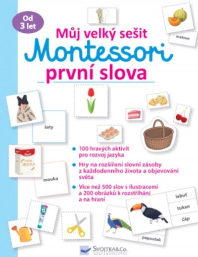 Velký sešit pro děti od 3 let je plný aktivit s prvky Montessori pedagogiky. Pomocí her a dalších činností v sešitě si dítě rozšiřuje slovní zásobu. Tento velký sešit Montessori je věnovaný dětem od 3 let. Děti se budou bavit poznáváním a pojmenováváním 500 obrázků znázorňujících předměty ze světa, který je obklopuje. V sešitě na ně čeká více než 100 hravých a 20 tematických aktivit (dům, kuchyň, zahrada, dopravní prostředky, barvy...) a 200 obrázků s odpověďmi na druhé straně, které si můžete vystřihnout a uschovat. Pomocí her v tomto sešitě si dítě rozvíjí jazyk a vyjadřovací schopnosti a rozšiřuje slovní zásobu z každodenního života. Sešit staví na principech Montessori pedagogiky, která klade důraz především na získávání zkušeností na základě pozorování a smyslového vnímání. Aktivity v sešitě jsou vytvořeny metodou "lekce ve třech krocích", které mají dítěti pomoci si zapamatovat probíranou látku.