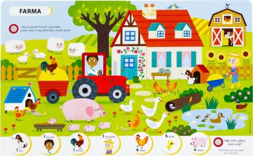 Hledej a poznávej s touto zvukovou knihou zvířata z rušné farmy! V různých částech farmy, od stodoly přes pastvinu až po drůbeží dvorek, se seznámíš s jejími obyvateli a dozvíš se i zajímavé informace. Na každé straně této krásně ilustrované knížky poslouchej nejrůznější zvuky a poznej, která zvířata je vydávají. Ale neboj! Dostaneš k tomu i nápovědy, které ti zvířata představí, a i zde se dozvíš další zajímavosti z farmy a ze zvířecí říše.