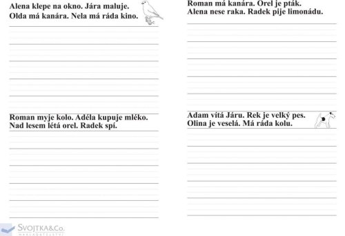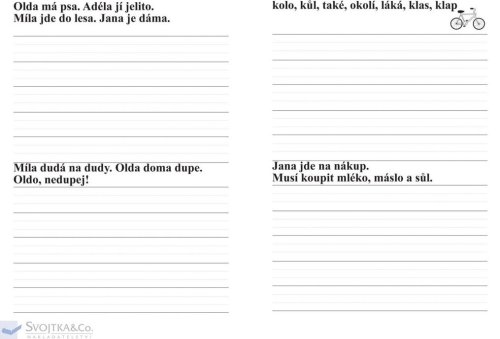 Nese, poleno, sen, nos, ten, lán, pán, nám… Ota mele maso. Alena sype sůl. Jana myje mísu. V tomto pracovním sešitě najdou rodiče prvňáčků praktická cvičení zaměřená na procvičování psaní slov a vět. Na každé z 32 linkovaných stran se dvěma pomocnými linkami jsou vždy tři cvičení k opisování a ke zdokonalení psaní všech písmenek abecedy.