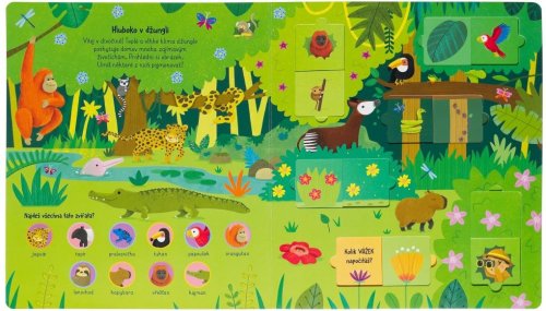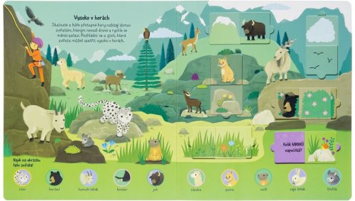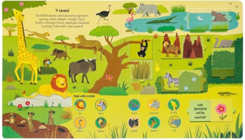 V této knize s posuvnými okénky se děti v 5 různých prostředí seznámí se zvířaty z celého světa. Každé prostředí je krátce uvedeno společně s úkolem na hledání nejrůznějších zvířat. Jasné ilustrace a popisky pomohou dětem lépe poznat říši zvířat a seznámit se s ní. Za posuvnými okénky se poté ukrývají úkoly na počítání a pozornost. Tato interaktivní kniha s roztomilými ilustracemi je ideální volbou pro všechny milovníky i milovnice zvířat a přírody.
