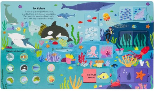 Interaktivní kniha s posuvnými okénky seznámí děti se zvířaty z celého světa v 5 různých prostředí, od barevných korálových útesů až po majestátní pohoří.