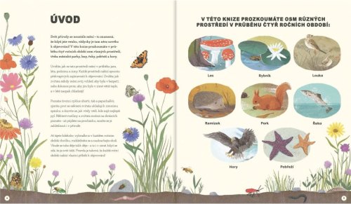 Svět přírody se neustále mění - to znamená, že když jste venku, vždycky je tam něco nového k objevování! V této knize prozkoumáte v průběhu čtyř ročních období osm různých prostředí, třeba městské parky, lesy, řeky, pobřeží a hory. Uvidíte, jak se tato prostředí mění v průběhu jara, léta, podzimu a zimy. Každé prostředí nabízí spoustu překvapivých zajímavostí k objevení a prozkoumání. Některé rostliny a zvířata možná na obrázcích poznáte - až půjdete na procházku, snažte se je zahlédnout i v přírodě.