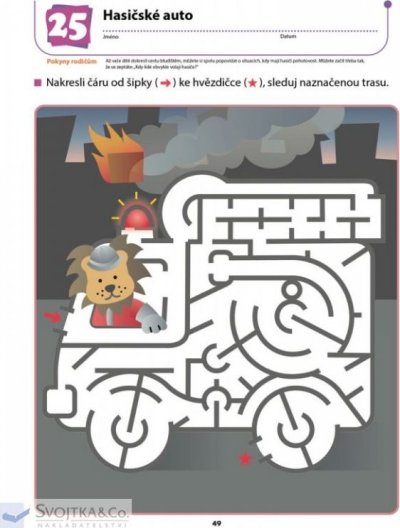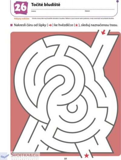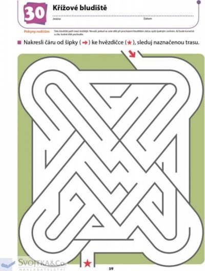 V tomto sešitě, založeném na výukové metodě Kumon, dítě rozvíjí prostorové vnímání a procvičuje si schopnost ovládat tužku, dovednost potřebnou pro psaní písmen a číslic. Nejprve bude vaše dítě kreslit cestu rozmanitými bludišti dle vyznačeného směru. Postupně, jak bude dítě při práci s tužkou čím dál obratnější, bude pracovat na složitějších bludištích. Procházením bludišti se zábavným způsobem učí, jak správně držet a používat tužku. Postupem od jednoduššího ke složitějšímu je dítě motivováno a není na něj vyvíjen žádný tlak, který by jej frustroval. Samo chce pokračovat v procvičování a na konci sešitu je jeho pokrok znatelný. Při procházení bludišti si dítě také osvojuje schopnost logického úsudku, rozumového zdůvodnění a vyhodnocení, neboť musí neustále přemýšlet a vyhodnocovat, jak vyjít z bludiště ven. Sešit snese i drsnější zacházení a opakované gumování.