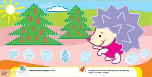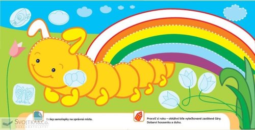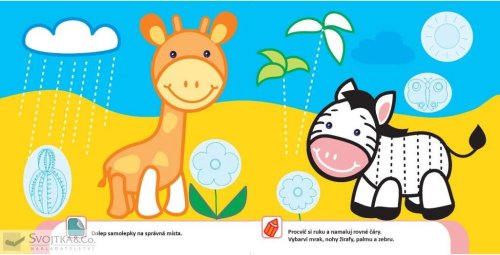 domaluj déšť – svislé čáry, domaluj kytaristovi struny – vodorovné čáry, domaluj ježkovi špičaté ostny – klikaté čáry, domaluj sněhulákům břicha – kroužky, domaluj duhu – obloučky, domaluj motýlkovi křídla – spirály, domaluj ovečce huňatý kožíšek – vlnovky dolep samolepky na správná místa tyto a ještě další úkoly najdete v této knížce, která je určena pro nejmenší děti od 2 do 3 let hravou formou si zde procvičí ruku při domalování a ještě zjistí svou šikovnost a postřeh při výběru a nalepování samolepek