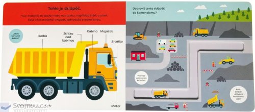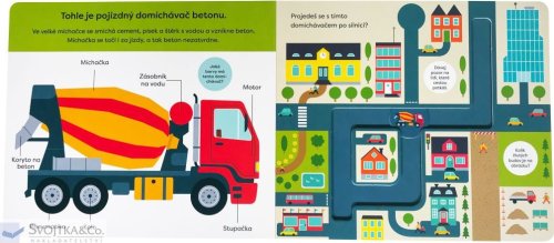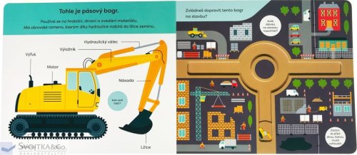 Domíchávač betonu, žlutý sklápěč a veliký bagr rozhodně nesmí chybět na žádné pořádné stavbě. Seznam se s obrovskými stroji a jejich funkcí a částmi, a poté se s posuvným kolečkem můžeš po stavbě projet a zjistit, jaká je náročná práce na stavbě a staveništi.