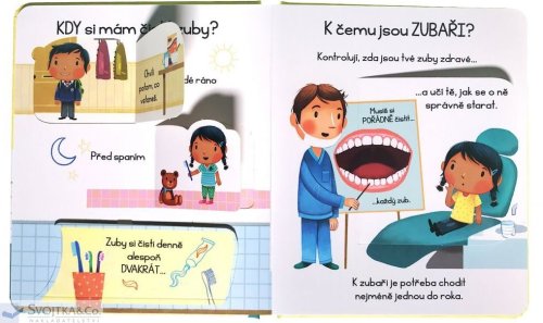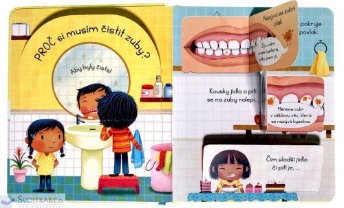 Leporelo s odklápěcími okénky jednoduše a srozumitelně seznamuje malé děti se zubní hygienou a odpoví na vše, co je ohledně čištění zubů zajímá. Nechce si vaše dítě čistit zuby? Bojí se zubařů? A co když vytáhne ten nejtěžší kalibr: "Zvířátka si taky nemusí čistit zuby!" Tato ilustrovaná knížka s odklápěcími okénky obsahuje odpovědi na nejčastější otázky dětí o zubech. Vysvětluje, k čemu jsou zuby dobré, proč dětem vypadávají, proč je důležité se o ně správně starat a chodit pravidelně k zubaři. A vysvětluje i to, že se zvířátka také o svůj chrup starají, i když nemají žádný kartáček. Díky tomuto krásně ilustrovanému leporelu už bude ranní a večerní hygiena jedna velká zábava!