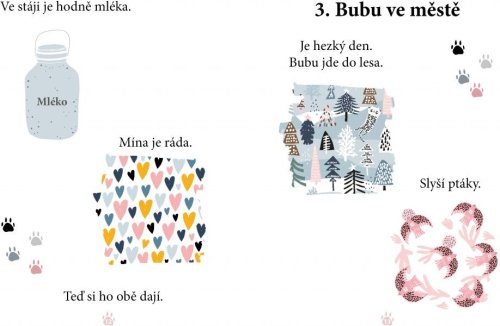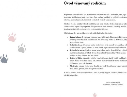 Krátké příběhy dvou koček Míny a Bubu mají písmo, které děti znají, spoustu milých ilustrací, jednoduchá slova a přívětivý rozsah. Dílčí čtenářské úspěchy tak děti motivují do dalšího čtení. Brzy si budou moct říct: Hurá, už zvládnu přečíst celou knížku