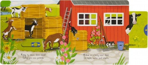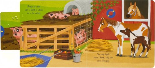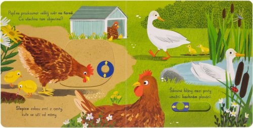 Pojďme prozkoumat rušný svět na farmě. Je pestrý, zajímavý a plný nejrůznějších zvířat. Prohlédni si obrázky a zjisti, co všechno na farmě můžeme objevit - slepice, kachny, kozy, prasata či koně. Ti všichni čekají na malé objevitele a objevitelky v tomto veršovaném leporelu s pohyblivými prvky. Obrázky lze oživit na každé stránce. Stačí tady zatáhnout, tam posunout nebo pootočit. Knížka zároveň rozvíjí jemnou motoriku.
