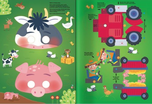 Zavítej na rušnou farmu, kde s ovcemi, koňmi, prasátky a kuřaty prožiješ pořádné dobrodružství. Z pevných stránek si můžeš vymáčknout úžasné masky a model traktoru! Nalepováním větších i drobnějších samolepek děti procvičí jemnou motoriku a koordinaci oka a ruky a dotváření stránek též podnítí dětskou představivost a fantazii.