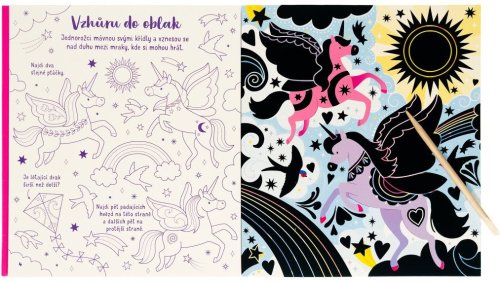 Uvnitř této knížky najdeš obrázky s jednorožci na vyškrabávání, ale také úkoly, hádanky a další aktivity s těmito magickými tvory.
