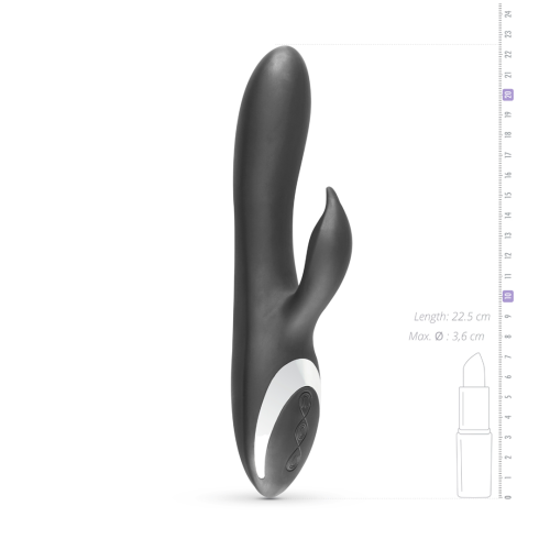 Vlastnosti a rozměry Voděodolný 2 motorky Celková délka: 22,5 cm Délka pro použití: 12 cm Délka dráždiče klitorisu: 5,5 cm Průměr: 3,6 cm Váha: 205g Nabíjení: USB konektorem