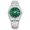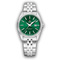 Dámské náramkové hodinky Napájení z baterie Průměr pouzdra 31,0 mm Pouzdro ve tvaru kruhu Ocelové pouzdro Stříbrná barva pouzdra Kovový tah Stříbrná barva tahu Ručičkový ciferník Zelená barva ciferníku Ciferník s dvanácti indexy Materiál skla - safírové sklo Odolné proti vodě během sprchování a mytí Datum