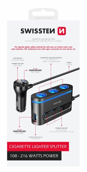 Kvalitně zpracovaná nabíječka do auta s výstupem USB, dvěma USB-C, podporou Power Delivery, Quick Charge 3.0 a výkonem 30 W. K dispozici jsou také tři CL výstupy s výkonem 108–216 W, které slouží k připojení autolednice či autokamery. Jednotlivé CL výstupy jsou vybaveny tlačítky pro vypnutí/zapnutí.