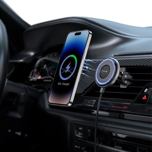 Praktický magnetický držák do ventilace auta s integrovaným bezdrátovým nabíjením pro pohodlné používání telefonu během jízdy.
