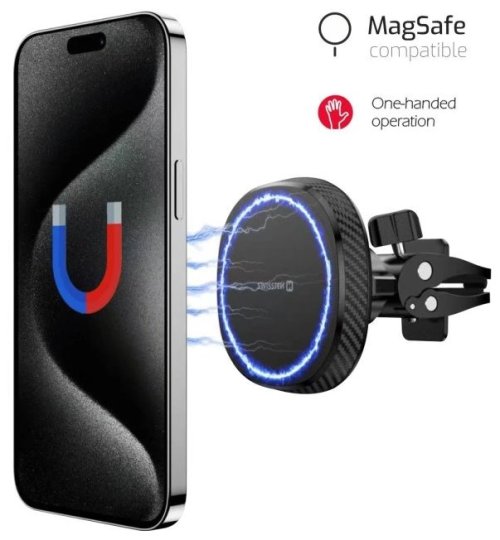 Magnetický držák do ventilační mřížky auta s podporou přichycení MagSafe zajistí pevné a bezpečné uchycení iPhonu. Velmi silné čelisti do ventilace se utahují ze zadní strany, tudíž zde nehrozí, že by držák vypadl. Zároveň díky kloubu, který drží magnet si pohodlně nastavíte a zafixujete úhel telefonu.