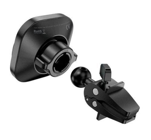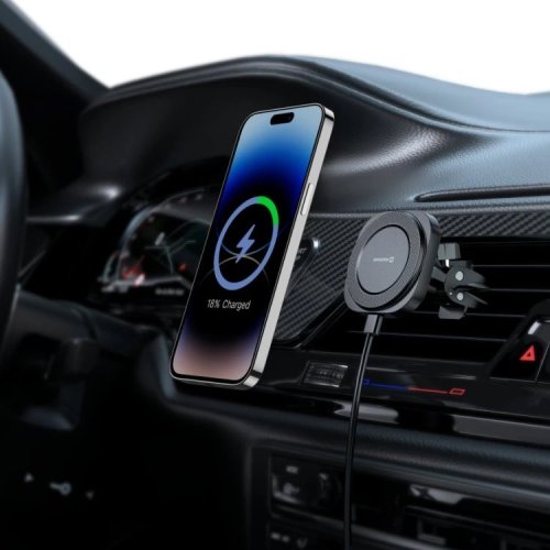 Magnetický držák a nabíječka 2 v 1 s aretačním šroubem pro uchycení do ventilace auta. Umožňuje bezdrátové Qi nabíjení i MagSafe nabíjení, to je určeno pro majitele iPhone 12 (a vyšších řad), přičemž sada magnetů dokonale zarovná iPhone s nabíječkou a nabíjení je tak maximálně efektivní. Tento magnetický držák se ale díky kompatibilitě s nabíjením Qi dá používat také k bezdrátovému nabíjení iPhone 8 a novějších modelů – a to s výkonem až 15 W.