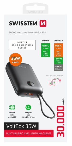S powerbankou SWISSTEN VOLTBOX 35 W 30 000 mAh máte zdroj energie pro vaše zařízení kdykoli a kdekoli po ruce. Kompaktní rozměry a nízká váha umožňují snadné přenášení, konstrukce z ohnivzdorného plastu zase bezpečnou manipulaci a ochranu proti poškození. Zavděčí se i náročným uživatelům, kteří potřebují nabíjet více zařízení najednou. Mezi hlavní přednosti patří integrované kabely, které usnadní nabíjení a prakticky eliminují zdlouhavé hledání toho správného konektoru.