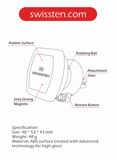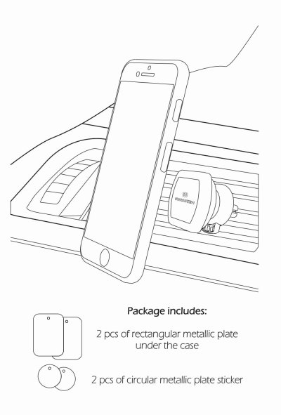 Magnetický držák pro mobilní telefon určený pro upevnění do ventilační mřížky. Díky speciálním čelistím drží v mřížce velmi pevně. Držák lze díky rotačnímu kloubu volně otáčet o 360°.