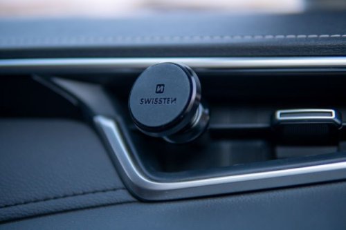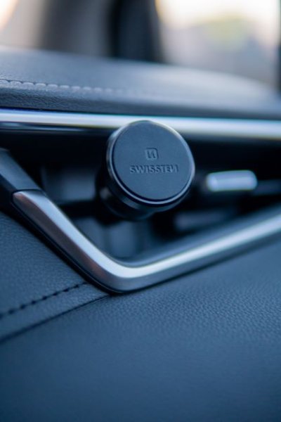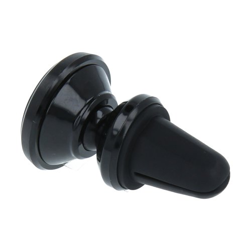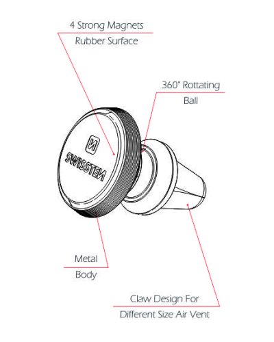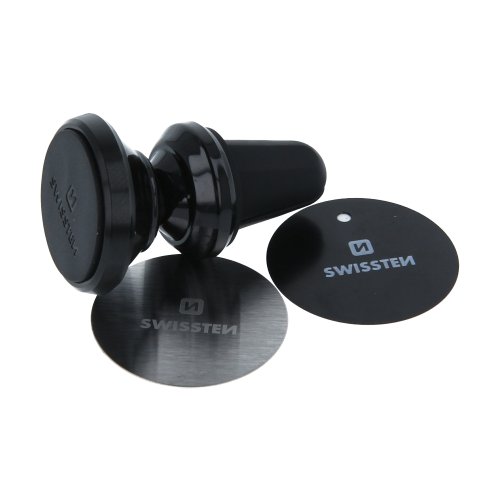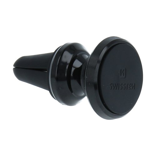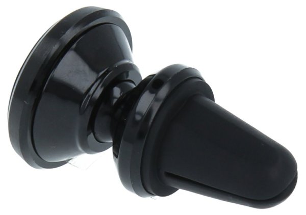 Kovový magnetický držák pro mobilní telefon určený pro upevnění do ventilační mřížky. Je opatřen šesti magnety a pogumovaným povrchem pro lepší zabezpečení telefonu. Držák lze díky rotačnímu kloubu volně otáčet o 360°.