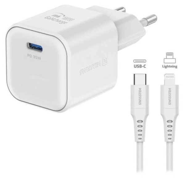 SWISSTEN GaN 1× USB-C PD 35 W + kabel USB-C/Lightning