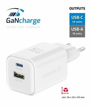 Univerzální napájecí adaptér s výkonem až 45 W. Pro nabíjení zařízení jsou k dispozici konektory USB a USB-C. Adaptér podporuje protokoly rychlého nabíjení Power Delivery a Quick Charge 3.0. Použitá GaN technologie snižuje tvorbu tepla, čímž zvyšuje účinnost nabíječky při zachování kompaktních rozměrů.