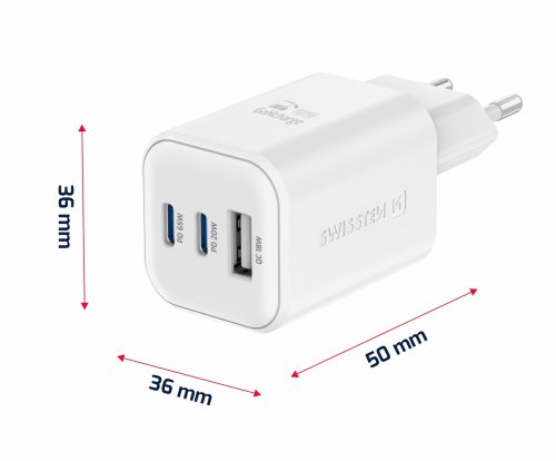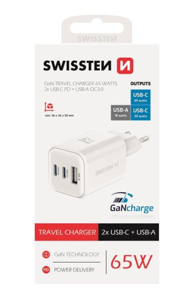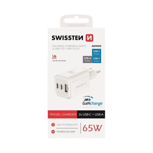 SWISSTEN GaN 2× USB-C PD 65 W + 1× USB QC 18 W